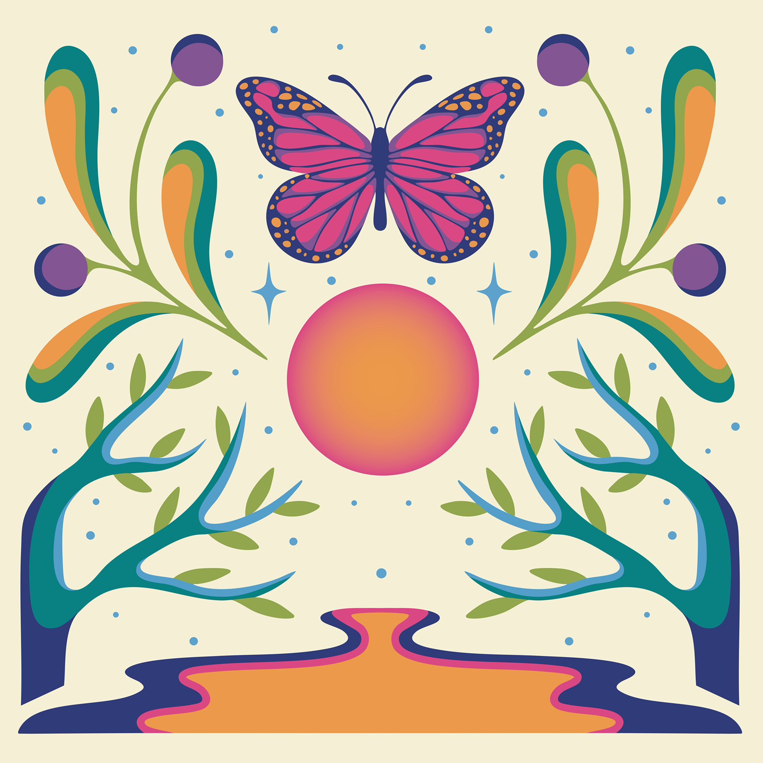The butterflies represent change, growth, and transformation. I love butterflies because they are delicate yet travel and survive long distances: they help pollinate entire continents and ensure so many species of plants thrive. They are tiny creatures that undergo so much change and embark on long, solo journeys, but remain steadfast in their missions and innate responsibilities