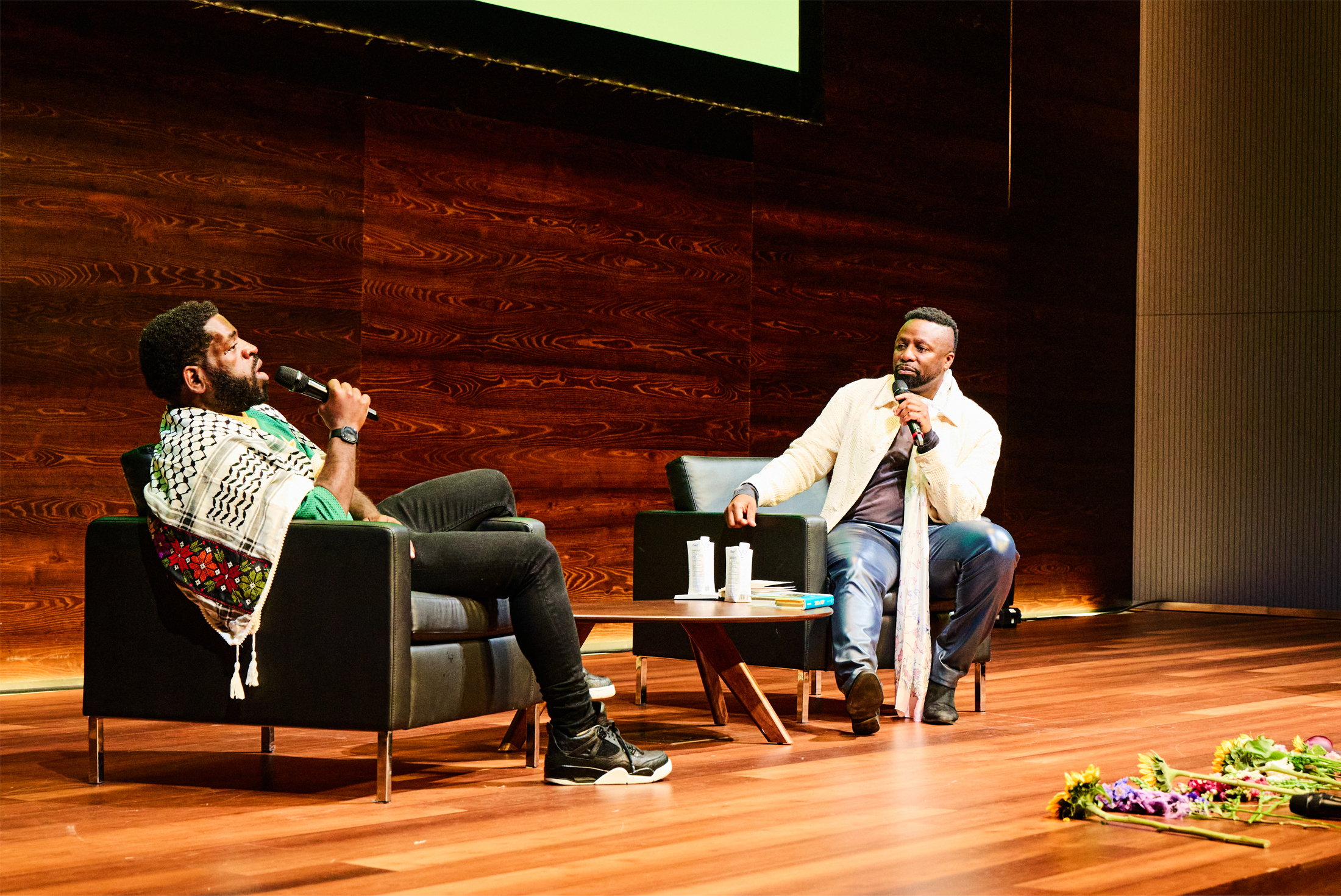 Hanif Abdurraqib and Antonio Michael Downing on stage at Textile’s inaugural Black Talk event in September 2024. The event was held at Waterloo’s CIGI Campus and supported by Waterloo Region Community Foundation. Photo taken by Jordan Berhe.